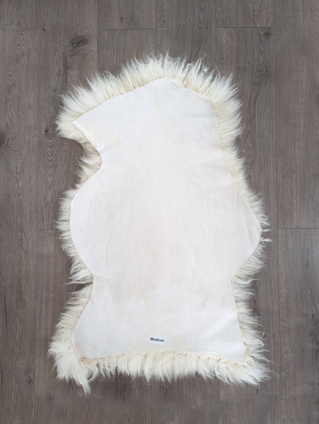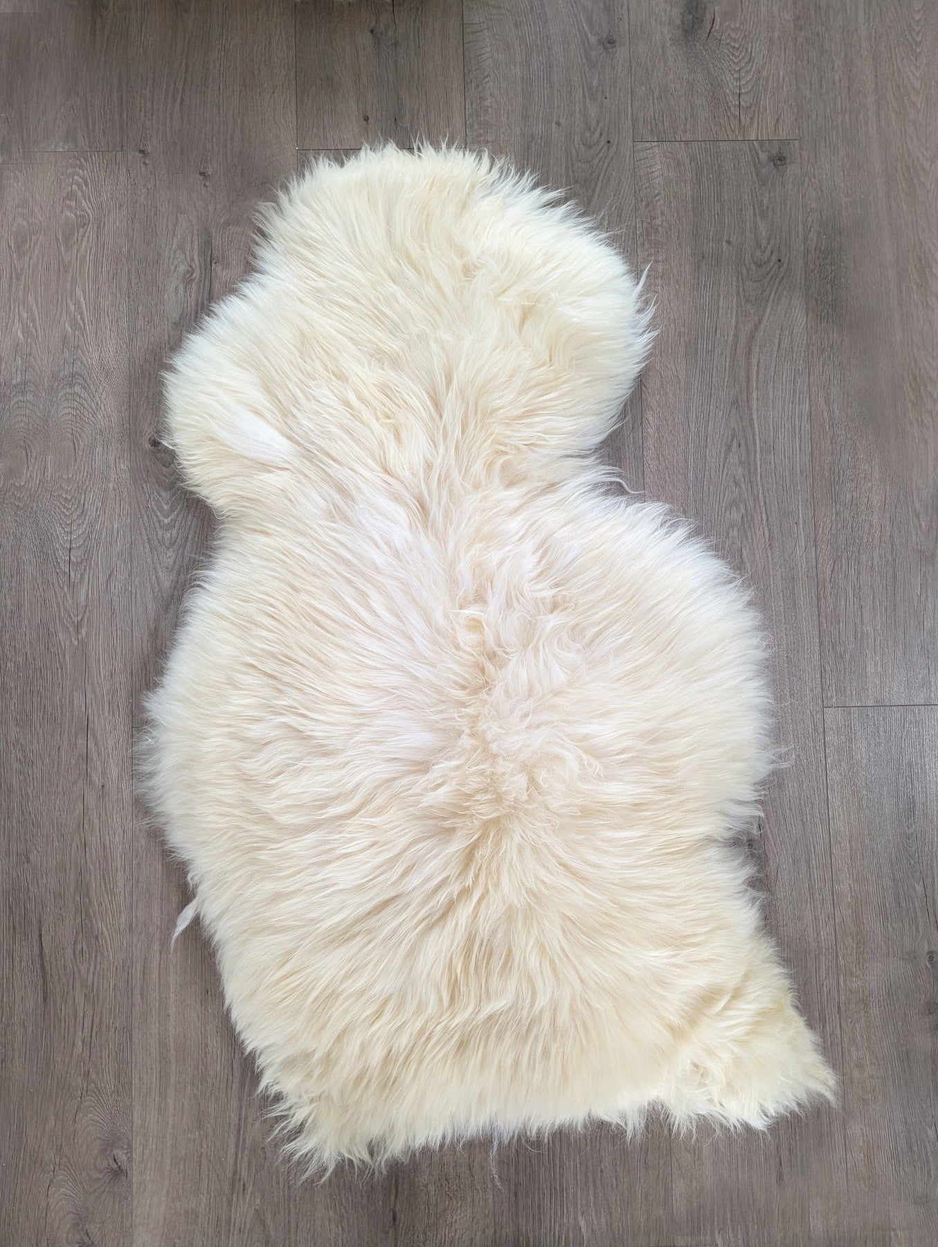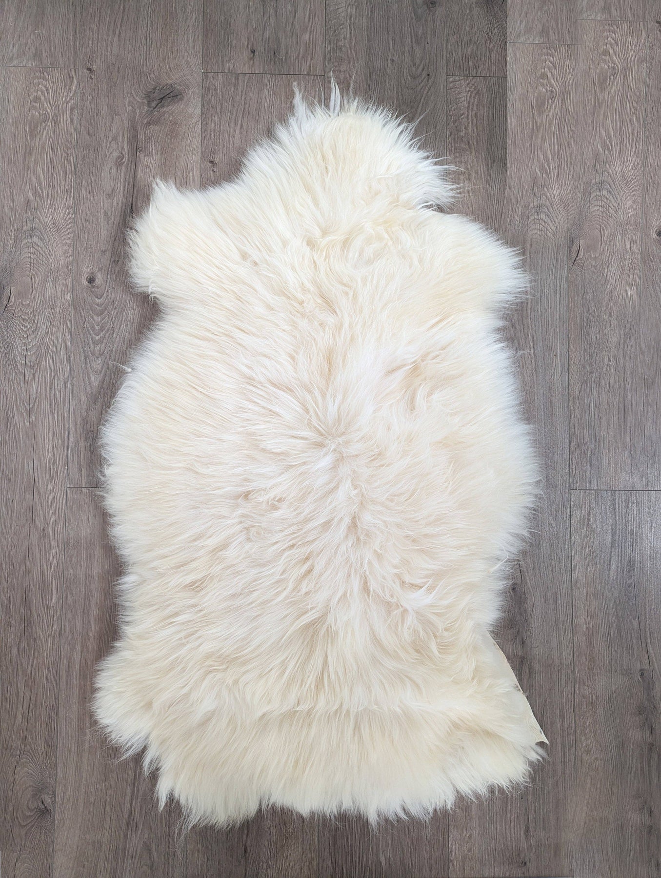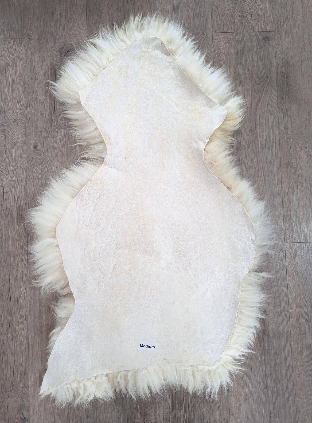 Beautiful natural sheepskin rugs made from British skins 🇬🇧 Grade A sheepskins with no stitches, repairs or mends on the back. Silky soft long dense wool pile. Perfect for rugs, sofa throws, chair pads, dining benches and pets! Colour: Natural Size: S, M, L, XL, Super (availability of sizes may vary from time to time) Natural colour sheepskins, but each sheep is unique! So sheepskins may vary from skin to skin. Colouring may vary from natural tones from whiter ivory to creamier naturals. Wool texture, length and density may vary too as well as shaping. The beautiful thing about these sheepskins is seeing the various tones and textures of each skin. Rare breed markings and coloured sheepskins also available. Natural doubles, quad, triples etc too. - Please message us. These are a natural product so size grading means the actual length and width may vary - please see chart image in pictures.